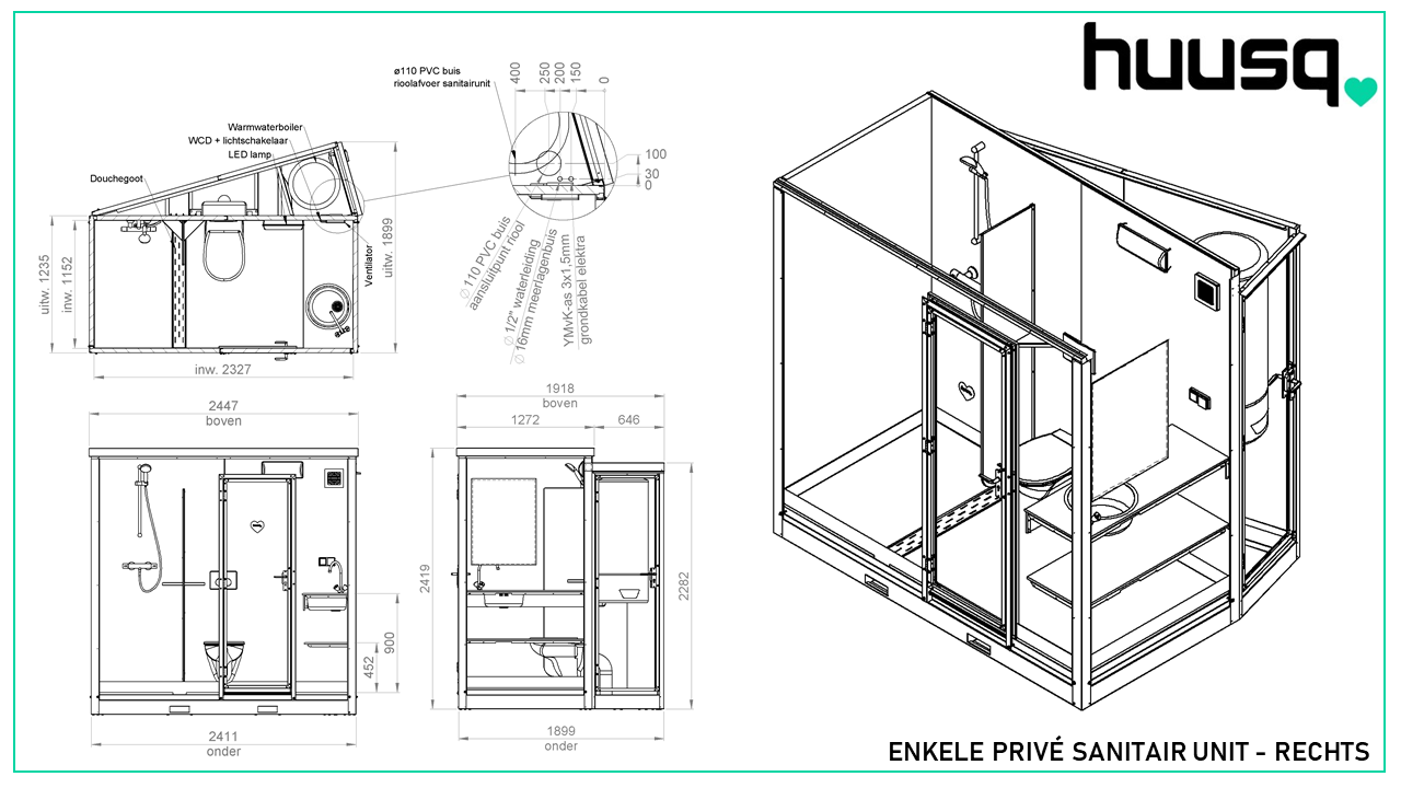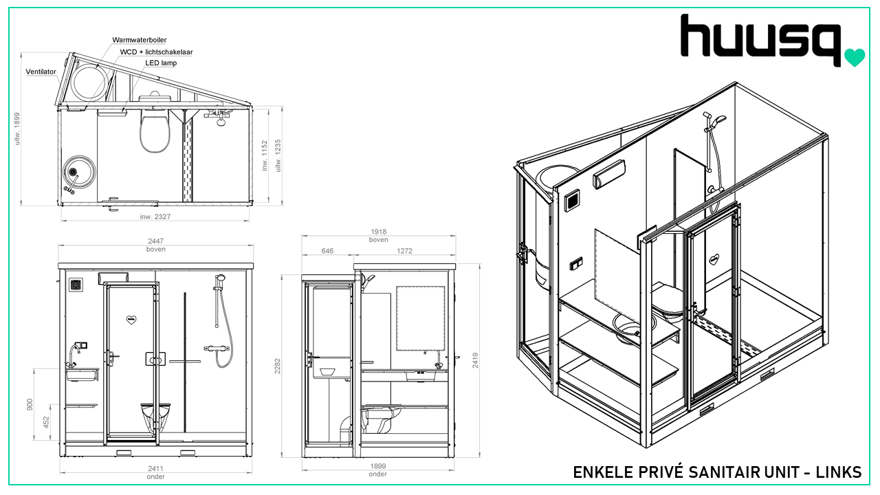 Elke single sanitair unit heeft een eigen afsluitbare technische ruimte met een warmtepomp-boiler, een reservoir voor het toilet en een aansluiting op water, elektriciteit en riolering. Huusq enkele units zijn leverbaar in twee versies, met de technische ruimte aan de linker of rechter zijde. Met een linker en rechter model kunt u een dubbele opstelling creëren.