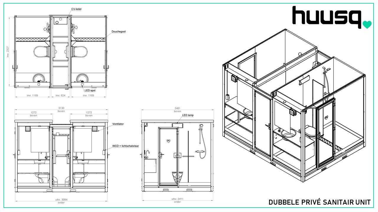 Een dubbele sanitair unit deelt de afsluitbare technische ruimte en bevat een boiler of CV-ketel en 2 reservoirs voor de toiletten en een aansluiting op water, elektriciteit en/of gas. Indien gewenst kan elke Huusq unit door u worden aangesloten op een (bestaand) elektriciteitsnet- en/of gasleiding.